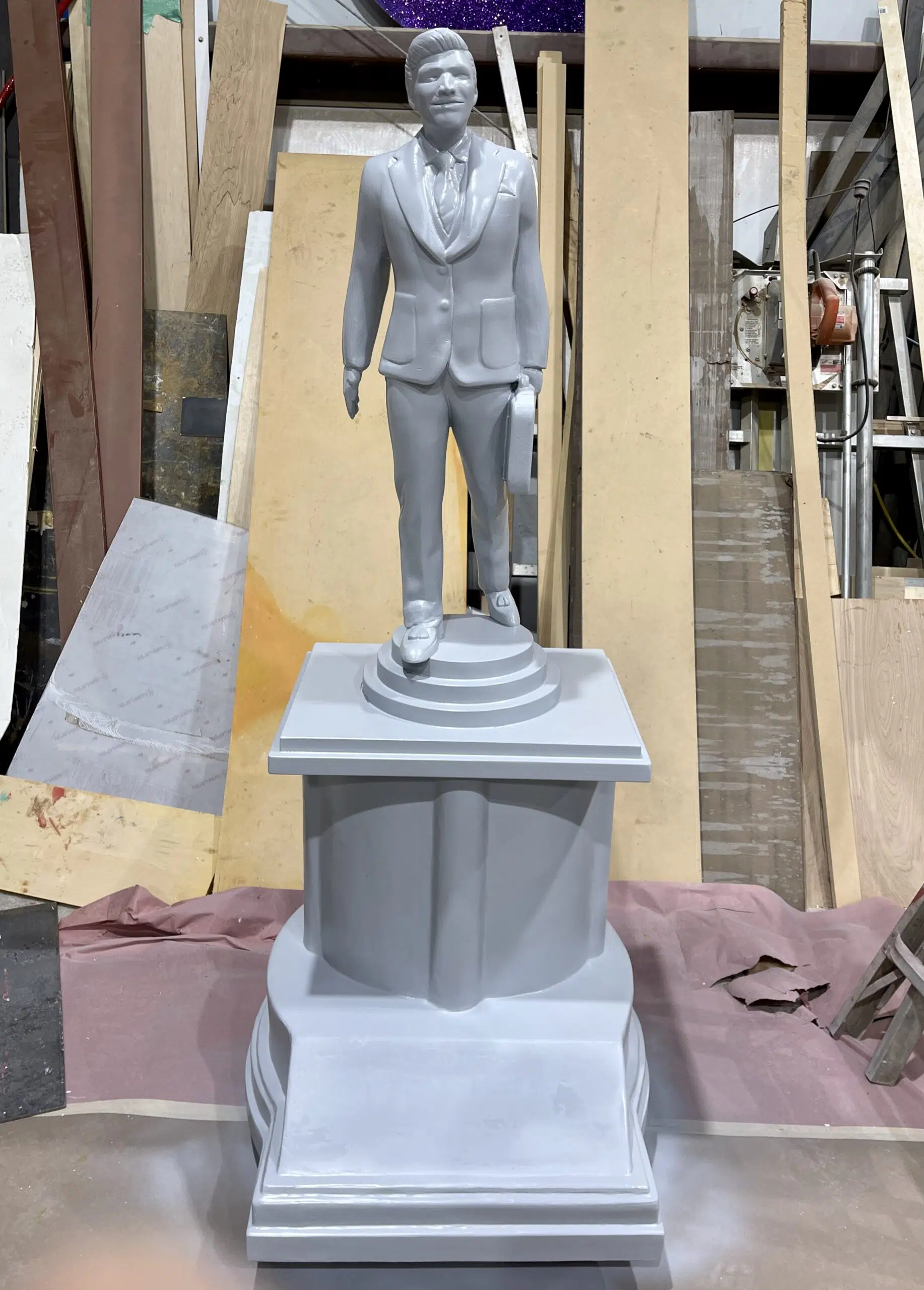This particular project took several weeks from start to finish. The first step was to have our 3D artist create the model replicating the Dundie Award. Once the model was created it was scaled up to a 6’ version, file was sliced to get ready for machining and then the carving started. For this project we chose to make the statue with HDU foam. HDU foam vs eps foam carves a lot smoother and helps cut down on sanding. When all the slices were finished carving our team started assembling all of the pieces together. After those pieces were put together, our sculptor went in and hand sculpted all the tiny fine details that our machine could not quite get. It is always amazing to get to take a moment to watch our sculptor do something that not all of our minds can process doing. The final steps that followed were hard-coating and then paint. We use an industrial grade paint buy Matthews paint that is perfect for outdoor sculptures, monumental art and outdoor signs. When this 6’ award was all complete he was off to Scranton, PA.